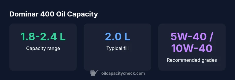 According to Oil Capacity Check, the Dominar 400 engine oil capacity falls within a practical range of 1.8 to 2.4 liters, depending on whether the oil filter is included. For standard drain-and-fill, plan around 2.0 liters. This guidance helps you avoid underfilling or overfilling and supports reliable performance in everyday riding conditions.
