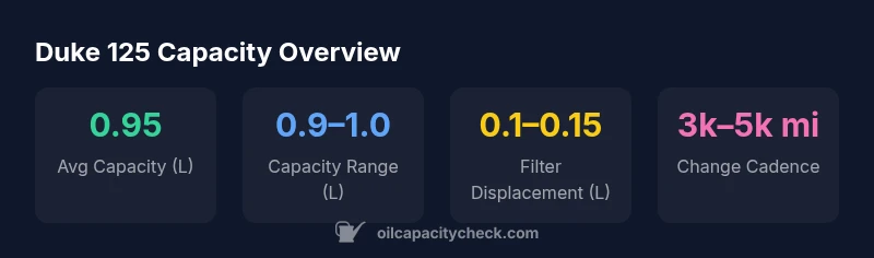 According to Oil Capacity Check, knowing the correct oil capacity for the Duke 125 is essential for reliable lubrication and engine longevity. The oil capacity refers to the total amount of oil required to fill the engine’s crankcase and oil filter during a complete oil change. For 2026 Duke 125 variants, the capacity generally sits around 0.9–1.0 liters with the filter installed, but exact figures vary by year, model variant, and whether the filter is included. Always verify the precise figure in the official service manual for your bike. In practice, enthusiasts should also consider the oil filter’s displacement, as that contributes to total oil volume. This nuance matters during maintenance planning and when switching oil brands or grades.