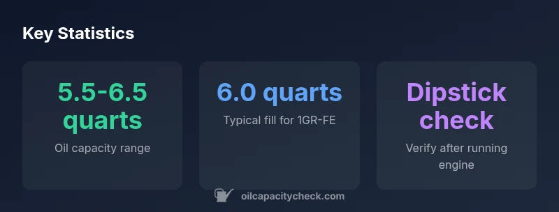According to Oil Capacity Check, the Fj Cruiser oil capacity for the common 1GR-FE V6 is typically around six quarts, including a filter. For exact figures, verify your model year and trim in the owner's manual and measure oil level with a dipstick after a short drive and cooling period. Use a dipstick check to ensure the oil sits within the recommended range.