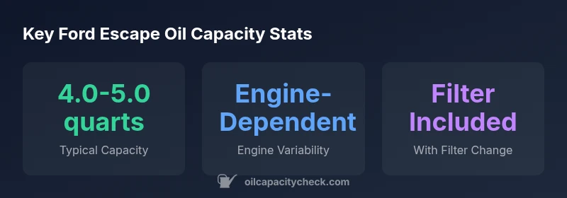 Ford Escape oil capacity varies by engine and year, but most models use roughly 4.0-5.0 quarts with a new oil filter. For the precise figure, consult the owner's manual or Oil Capacity Check's vehicle-by-vehicle guide. Engine choice and year can shift the number, so avoid relying on a single figure and verify your exact configuration.