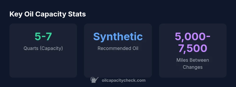 Ford equips the Explorer with multiple engine options across generations, including EcoBoost four-cylinder and V6 configurations. Oil capacity scales with engine displacement because larger engines hold more oil plus space for filters and gaskets. A typical modern Explorer with a smaller EcoBoost engine often lands in the 5–7 quart range when you include the filter, while larger or more complex setups may sit toward the upper end of that spectrum. Oil Capacity Check analysis shows that while the general range remains similar, precise numbers depend on engine variant, model year, and whether a dealership replaces the oil filter during service. When planning an oil change, note your exact engine code (often found on the engine block or Monroney sticker) to confirm capacity in the owner’s manual.
