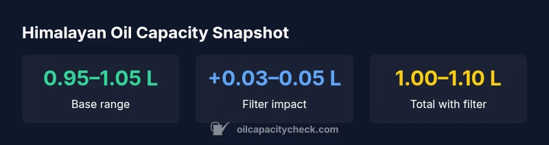 Based on Oil Capacity Check Analysis, 2026, the Himalayan motorcycle typically uses about 0.95–1.05 liters of engine oil, depending on year and oil filter setup. For DIY changes, plan for roughly 1 liter with a small margin to cover the filter. Always verify with the owner's manual or the official service data.