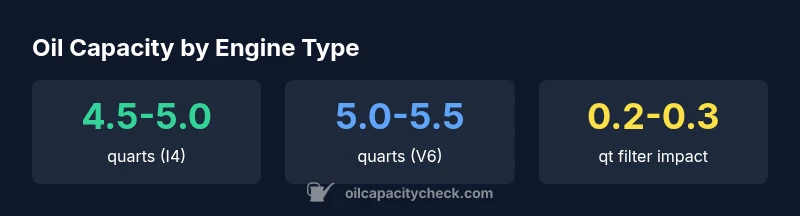 For the 2.4L I4, the oil capacity typically falls in the 4.5-5.0 quart range with a new filter. Exact figures depend on the filter size and whether you perform a full drain or a top-off.