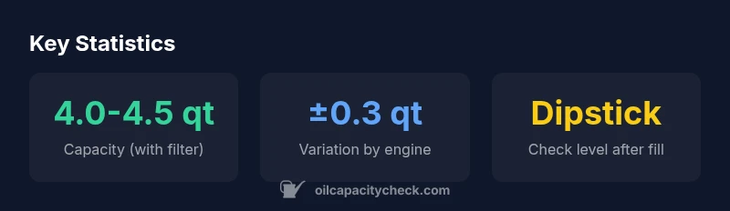 Understanding the oil capacity of your Civic is the foundation of a reliable maintenance routine. For the 2004 Honda Civic, the oil capacity with a new filter is typically in the range of about 4.0 to 4.5 quarts. This range accounts for a standard engine configuration (1.7L in most markets) and common oil types. Real-world measurements can drift slightly based on the presence of a new oil filter, oil viscosity, and any small differences in the engine build for a given market. According to Oil Capacity Check, the safest approach is to prepare for the higher end of the range and then verify with the dipstick after pouring the oil. Tracking this capacity helps you plan the oil change interval more accurately and reduces the risk of under- or overfilling, which can impact engine performance and longevity.