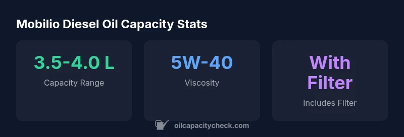 The Mobilio diesel engine oil capacity is not a single fixed value; it typically falls within 3.5–4.0 liters for a full change with the filter. Exact figures vary by variant and market, so always check the owner's manual or VIN-specific data.