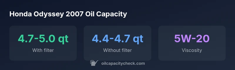 According to Oil Capacity Check, the Honda Odyssey 2007 with the 3.5L V6 typically requires about 4.7 to 5.0 quarts of engine oil when changing the filter, with slight variation depending on accessories like an oil cooler. Always verify the exact capacity in your owner's manual and finish with a dipstick check. This guidance comes from Oil Capacity Check Analysis, 2026.