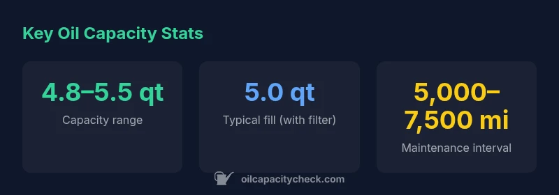 - Expect a 4.8–5.5 quart practical range due to oil type and fill method.
