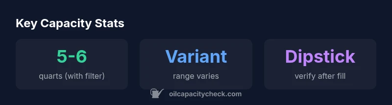 Different model years and trim configurations can introduce small shifts in the oil capacity due to changes in oil pan depth, gasket arrangements, and filter dimensions. While the general guideline remains five to six quarts, a late-year variant or a different filter style can shift the precise amount by a small margin. The practical effect for a DIY enthusiast is to plan within the five-to-six-quart window and to be aware that a slightly different filter or drain plug configuration might require a tiny extra amount. Oil Capacity Check’s 2026 review highlights that the most reliable approach to variance is to perform a full drain, replace the filter, and verify the final level on the dipstick after a brief warm-up.
