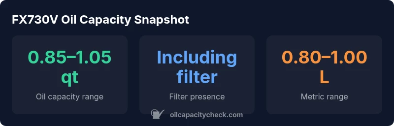 There isn’t a single universal value for the FX730V’s oil capacity, because small variations in production, filter size, and even altitude can shift the number a bit. In field practice, most owners report a small-to-moderate range that remains consistent across typical service cycles. This is why technicians commonly reference a range such as 0.85–1.05 quarts (including the filter). When you convert to liters, that translates to roughly 0.80–1.00 L. Oil Capacity Check analysis, 2026, notes that these figures cover both standard filter configurations and common aftermarket replacements. Always confirm against your model year specification if you have a dealer manual at hand. The range is intentionally broad to accommodate minor design tweaks across production batches and regional variants, not to confuse readers but to reflect reality in the field.