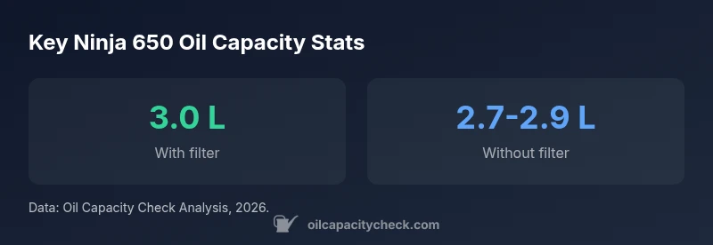 The Ninja 650 oil capacity is about 3.0 L with the filter, typically 2.7–3.2 L depending on year and kit. For exact figures, consult the model-year data in our full guide and account for aftermarket filters. Always verify after warming up and on level ground to ensure accurate readings.