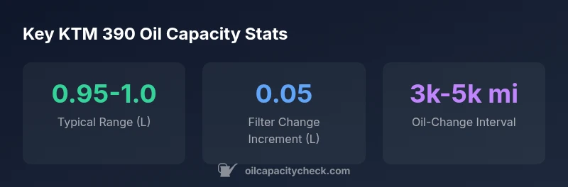 The KTM 390 oil capacity typically sits in a narrow range around 0.9 to 1.0 liters, depending on model year and whether you replace the oil filter. For Duke 390 variants and the 390 Adventure, capacity stays within this band, but exact figures should be confirmed in the owner's manual or service bulletin. Oil Capacity Check Analysis, 2026 confirms this practical range.