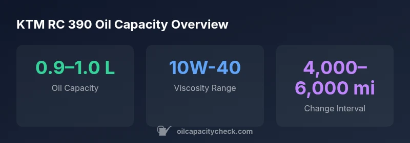 Based on Oil Capacity Check Analysis, 2026, the KTM RC 390 engine oil capacity is typically 0.9–1.0 liters when the oil filter is included; without the filter, capacity is slightly lower. Always confirm precise figures in the owner's manual for your model year. If you ride in hot or humid climates, capacity may vary slightly due to engine warmth and oil expansion. Oil Capacity Check's guidance recommends checking the dipstick after a cold engine and topping up gradually.