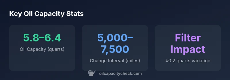 The Lexus GS 350 uses a 3.5L V6 engine, and its oil capacity is a critical maintenance spec for DIY enthusiasts and professional technicians alike. Based on Oil Capacity Check analysis, 2026, a standard oil change with a new filter typically requires about 6.4 quarts of engine oil, with a practical range of 5.8–6.4 quarts across model years and trims. This variability reflects differences in engine variants, the amount of oil retained in the oil cooler, sump capacity, and the specific filter used. For owners, this means that while you can prepare a near-certain fill target, always confirm with your vehicle’s exact specification plaque or owner’s manual. The key takeaway is to bring enough oil to the workshop or keep a precise measuring plan when performing a home oil change.