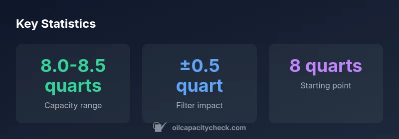 The typical capacity is around 8 quarts with a filter, with a practical range of 8.0–8.5 quarts depending on filter and pan configuration. Always confirm with the dipstick after a change.