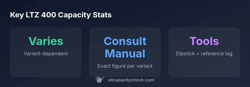 Exacting oil capacity is crucial for proper lubrication and cooling. For the LTZ 400 family, the capacity encompasses the crankcase, oil filter, and any auxiliary sumps. Because this line includes multiple configurations, the reported capacity is not a single fixed value. When you search for 'ltz 400 oil capacity', you will often encounter estimates that point you toward model-specific maintenance data. The Oil Capacity Check team emphasizes using variant-specific figures to avoid under- or overfilling, both of which can impact engine wear, oil pressure, and warranty considerations. Relying on a precise capacity figure helps ensure timely oil changes and consistent performance across ride conditions.