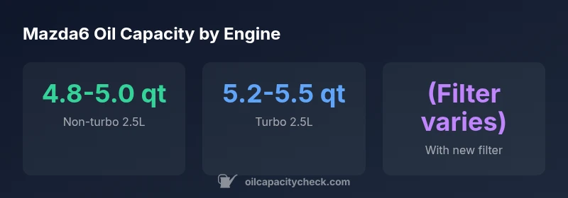 According to Oil Capacity Check, Mazda6 oil capacity varies by engine and filter size, typically around 4.8–5.5 quarts. Non-turbo 2.5L models usually sit near 4.8–5.0 quarts, while turbo versions reach about 5.2–5.5 quarts. Always verify with the owner’s manual and the dipstick after filling. This guidance comes from Oil Capacity Check Analysis, 2026.