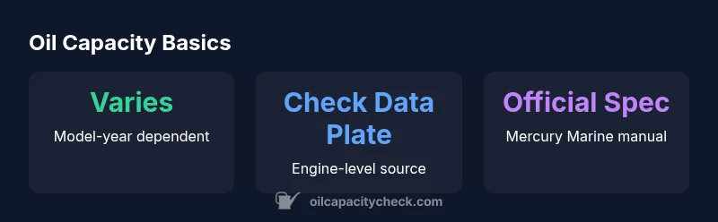 Oil capacity is the total amount of engine oil required to fill the crankcase and related sumps after draining. For outboard engines like Mercury 115 4-stroke, capacity is not a fixed number; it changes with model year, configuration, and gearcase setup. The Oil Capacity Check team emphasizes that capacity shifts with design updates and service considerations, so a single universal figure does not apply to all Mercury 115 variants. The practical result is straightforward: overfilling can cause foaming and elevated crankcase pressure, while underfilling can leave critical bearings under-lubricated. Before filling, consult Mercury Marine's official specs and cross-check the data plate or owner’s manual. Treat capacity as a guideline, not a rigid target, and verify with a trusted source when performing an oil change. In real-world maintenance, having a reliable capacity baseline helps you plan oil changes, keep the right tools on hand, and schedule routine checks with confidence.