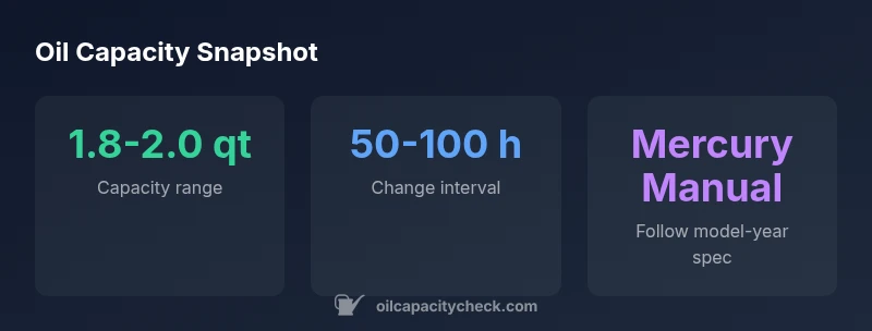 Oil capacity is not a single universal figure; it is the result of the engine’s oiling system design, pan size, and whether a filter is part of the drain. The Mercury design for late 4-stroke outboards often uses a compact sump with a dedicated oil pickup. When Mercury issues design updates, capacity can shift slightly to accommodate new filters, baffles, or oil cooler configurations. Oil Capacity Check analyses in 2026 show that while most boats hover around 1.8–2.0 quarts, some variants may sit a touch higher or lower depending on the exact spec. Always reference model-year documents for precision.