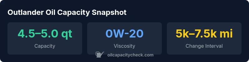 For most Outlander models, the capacity is around 4.5–5.0 quarts with a new filter. Exact figures depend on the engine and model year, so consult the official manual for your vehicle.