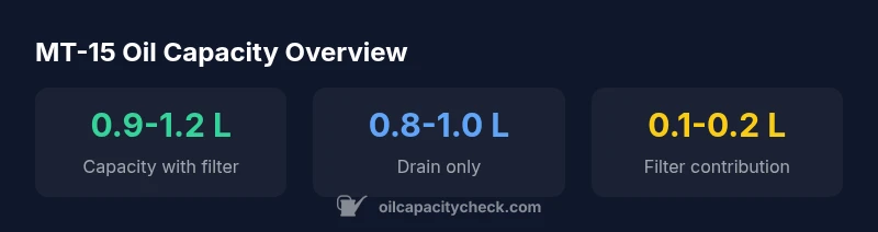 The MT-15 engine oil capacity, including the oil filter, typically ranges from 0.9 to 1.2 liters. Drain-only capacity without a new filter is roughly 0.8 to 1.0 liters, with a filter adding about 0.1 to 0.2 liters. Capacity can vary by model year and regional variants, according to Oil Capacity Check Analysis, 2026.