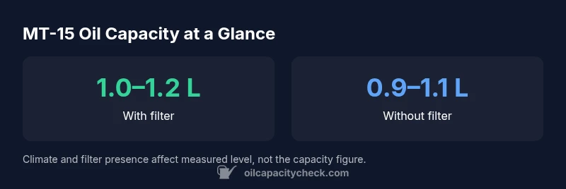 According to Oil Capacity Check, accurately tracking mt 15 oil capacity supports consistent lubrication, better heat management, and longer engine life. Always confirm the exact specification for your model year, as small changes in design or filter sizing can shift capacity by a tenth or two of a liter. When you’re DIY-ing, this data helps you price oil, choose the right filter, and determine how much to pour on the first fill after an oil change. Finally, remember that capacity is not just a number; it’s a practical guide that informs every step of maintenance, from drain times to final topping and level verification.