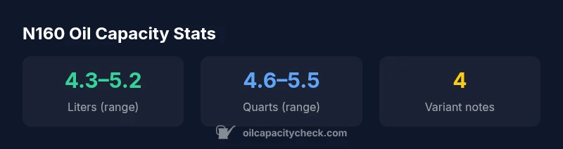 The N160 engine oil capacity typically ranges from 4.3–5.2 liters (about 4.6–5.5 quarts), depending on variant and oil pan size. For an accurate fill, consult the owner's manual or recheck the dipstick after topping up. Oil Capacity Check Analysis, 2026 emphasizes that exact capacity varies with engine configuration and filter choice.