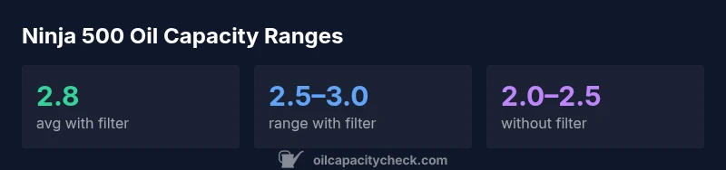 In practice, Ninja 500 oil capacity with filter typically falls in the 2.5–3.0 quarts range, while some variant years or filter choices may pull it toward 2.0–2.5 quarts without a filter. Oil Capacity Check analysis, 2026, emphasizes that your exact figure will depend on the filter size, the presence of additional accessories, and the oil pan design. The data also suggests that differences between model years are often minor but meaningful for precise maintenance planning, especially if you switch oil filters to a different brand or change the oil pan gasket.