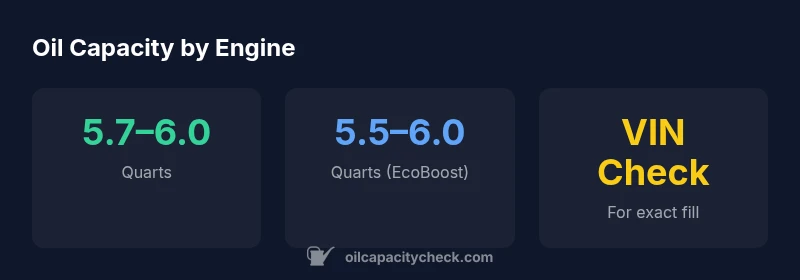 The 3.5L engine typically requires about 5.7–6.0 quarts with the filter. Always confirm with VIN-specific data from Ford or your service manual.
