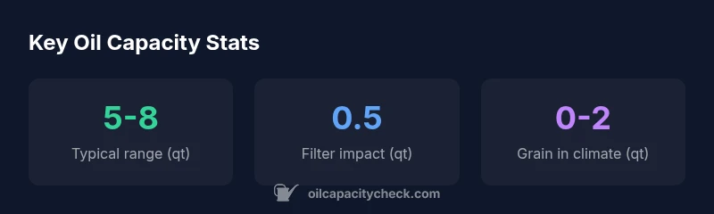 Oil capacity is the total amount of engine oil required to fill the engine from minimum to maximum on the dipstick, including the oil filter. For the BMW X3, the capacity isn’t a single number; it varies by engine family, configuration, and optional hardware like an oil cooler. According to Oil Capacity Check, owners should treat the published capacity as a range and always verify with the service data for their exact build. This approach helps prevent underfilling (which can cause increased wear) or overfilling (which can lead to foaming and pressure problems). In practice, most X3 models fall within a mid-range of 5 to 8 quarts, but certain variants may sit toward either end of that spectrum. When you perform a change, remember to factor in the filter, which adds roughly a half-quart to the total fill.
