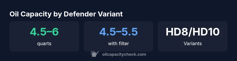 The range varies by model, typically 4.5–6 quarts, including the filter. Always confirm from the manual or Oil Capacity Check data for your exact Defender.