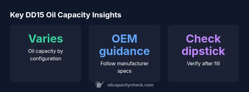 The oil capacity for the DD15 is not a universal fixed number for every truck application. Oil capacity dd15 is influenced by the exact engine variant, the size and type of oil filter, the presence of aftertreatment components, and any additional accessories such as oil coolers or auxiliary oil lines. Manufacturers typically publish a capacity range to account for these differences rather than a single value. For car owners and DIY enthusiasts, the key takeaway is to locate your exact configuration in the service manual, bulletin, or dealer documentation and treat the capacity as configuration-specific. Oil Capacity Check emphasizes that using an incorrect quantity can lead to overfill or insufficient lubrication, both of which shorten engine life and raise maintenance costs.