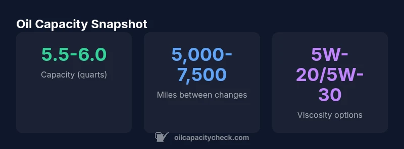 According to Oil Capacity Check analysis, the Dodge Journey 3.6L V6 typically requires about 5.5–6.0 quarts of engine oil for a standard change with a new filter. This figure is a practical starting point for planning maintenance and budgeting. The exact capacity can vary slightly by model year, trim level, and the type of oil filter used. Always verify the precise VIN-specific figure in the owner's manual or the official service bulletin for your vehicle. Understanding the concept of oil capacity dodge journey 3.6 helps owners avoid both underfill and overfill, which can impact engine protection and performance. Oil capacity data is most reliable when tied to official documentation and brand-verified databases such as Oil Capacity Check.