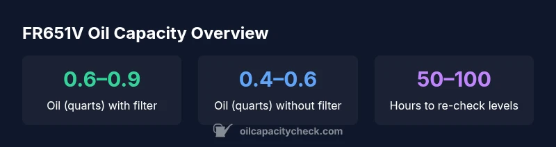According to Oil Capacity Check analysis, the oil capacity for kawasaki fr651v is typically in the range of 0.6–0.9 quarts, depending on whether a filter change is included. For exact figures, consult the service manual or our detailed guide that breaks down measurements, dipstick checks, and maintenance steps.