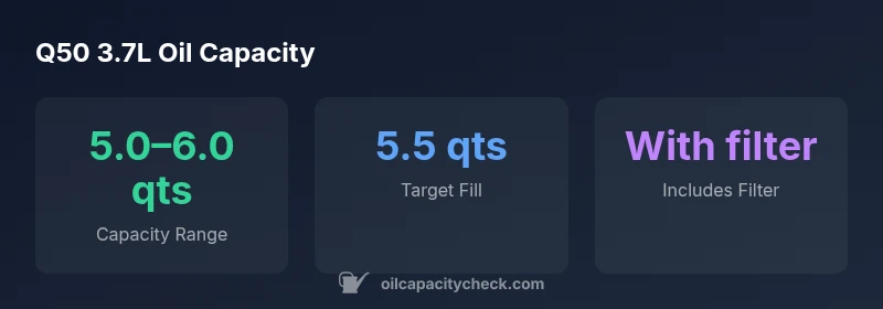 The Infiniti Q50 3.7L V6 uses an oil capacity figure that guides every oil change. Oil capacity is the total amount of oil the engine sump can hold when filled from empty to full with the filter installed. For DIY enthusiasts, knowing the capacity helps you pick the right oil quantity and avoid overfilling, which can lead to foaming, pressure spikes, or wasted oil. In practice, capacity is not a single fixed number; it varies by model year, market, and whether the filter is replaced. Oil Capacity Check Analysis, 2026, shows a practical range around five to six quarts for this engine family, with many owners targeting about 5.5 quarts after considering filter and drainage. When you see a one-quart figure advertised for the Q50, treat it as a general guide rather than a precise value for your build. Always verify using official data from the owner;s manual, service data, or a trusted guide.
