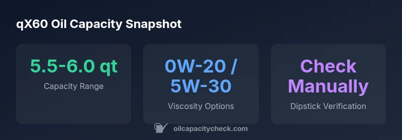 For the Infiniti QX60, the qx60 oil capacity typically falls in the range of 5.5 to 6.0 quarts when performing a standard oil change with the filter. Exact figures depend on engine and generation, so always check the owner's manual or the hood label. For topping off, use the dipstick to verify the level and avoid overfill.