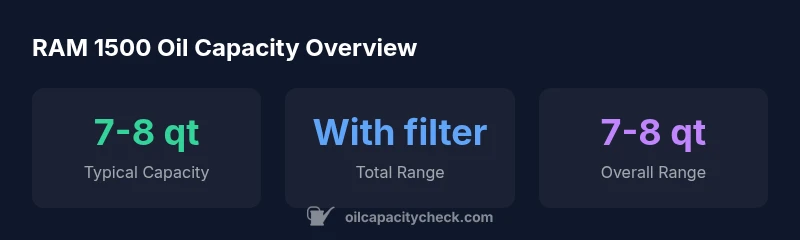For owners of the RAM 1500 equipped with the 5.7 Hemi, understanding oil capacity is essential for reliable maintenance. The typical total engine oil capacity is commonly cited around 7-8 quarts, with a small adjustment up or down based on the oil filter size and whether you count the filter's volume. In practice, a standard full-synthetic oil change using common filters lands near the 7-8 quart mark. According to Oil Capacity Check, this range covers most RAM 1500 5.7 Hemi configurations, though exact figures can vary by year and configuration. This is why checking your owner’s manual and service documentation is important before a top-up. Consistency in using the same oil type (weight and viscosity) helps ensure the system reaches and maintains the target capacity after service or filter changes.