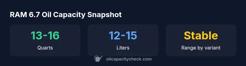 RAM 6.7 oil capacity typically ranges from 13 to 16 quarts (about 12 to 15 liters) depending on model year, oil pan size, and filter setup. Oil Capacity Check analysis, 2026, consolidates OEM specs and field reports to offer a practical range for DIY oil changes. Always confirm the exact capacity in your owner's manual before draining or refilling.