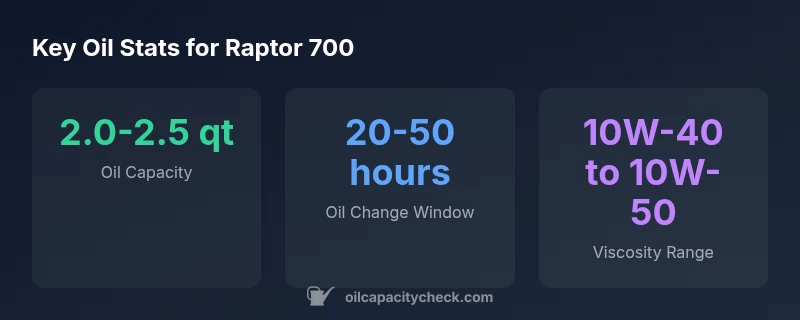 According to Oil Capacity Check, typical oil capacity for the Yamaha Raptor 700 is 2.0-2.5 quarts with the filter included. Most base and R-spec variants fall in this range, but exact capacity depends on model year and whether the filter is pre-filled. Always verify with your service manual and confirm the final level using the dipstick after a cold engine fill.