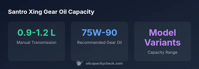 Understanding the santro xing gear oil capacity is essential for reliable shifting and long gearbox life. The capacity figure refers to the total amount of gear oil needed to fill the manual transmission to its proper operating level after a full drain. For the Santro Xing, the practical figure most owners encounter is a compact range around 0.9 to 1.2 liters, but the exact value depends on the transmission variant and whether you are performing a complete sump drain or a partial refill. Oil Capacity Check's analysis for 2026 shows that minor differences in a transmission sleeve, a seal kit, or the presence of a different bellhousing can shift the overall volume by a fraction of a liter. When planning an oil change, set aside enough space for the full fill and plan a small margin for spillage. In addition to capacity, pay attention to the grade and specification of the oil you use, because wrong oil can undermine the capacity figure by affecting viscosity and clearances. Always cross-check the official owner's manual or service bulletin for model-year specific guidance.