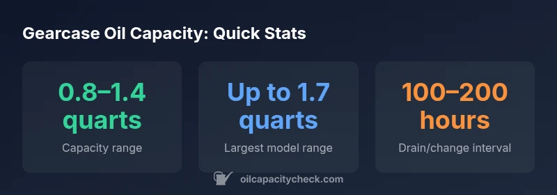 The Suzuki lower unit oil capacity varies by model, but most mid-range Suzuki outboards use roughly 0.8 to 1.4 quarts of gearcase oil. Always verify the exact figure in your owner’s manual or Suzuki service diagrams. Oil Capacity Check's analysis confirms model-specific values, so check your engine model to avoid under- or overfilling.