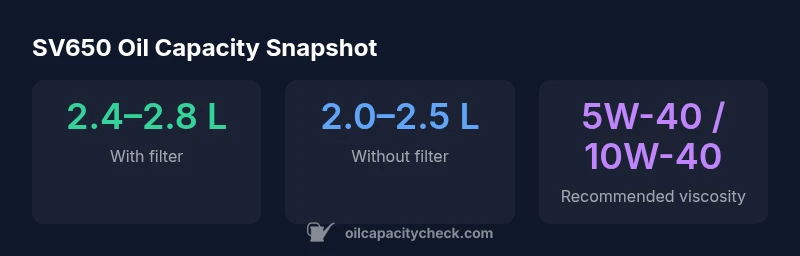 - Know the SV650 oil capacity range: ~2.4–2.8 L with filter