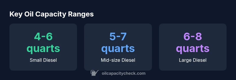 Oil capacity correlates strongly with engine displacement, cylinder count, and sump design. A smaller diesel might offer a compact sump with a lower oil volume, while a larger variant could include extra capacity to support higher oil flow in turbocharged configurations. Turbocharged diesels often require more oil for lubrication due to higher operating pressures, while engines with advanced filtration might reclaim capacity elsewhere. The interplay between oil capacity and oil pressure means that a miscalibrated fill can affect oil pressure, temperature control, and wear. The Oil Capacity Check team emphasizes that exact figures come from official service data and should be treated as variant-specific.