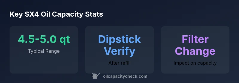 The sx4 engine oil capacity is not a fixed number; it varies by engine variant, model year, and service actions such as filter replacement. For car owners and DIY enthusiasts, this means you cannot rely on a single value across every SX4. Oil Capacity Check's analysis, based on official service manuals and industry standards, indicates that most owners operate within a practical range rather than a single figure. A clean, organized approach starts with identifying your exact engine code (for example, 1.6L vs 2.0L) and noting whether your maintenance includes a full oil-filter change. In many markets, this leads to a typical span of roughly four and a half to five quarts when performing a standard oil change with a new filter. But you should always confirm the specification for your market and year, because small variations exist. After you read the official spec, the next step is to verify with a dipstick after you add oil to reach the upper end of the full range. This simple check helps avoid both underfill and overfill scenarios, which can affect lubrication and engine performance. Oil Capacity Check's role is to provide a structured framework to interpret the data you find in manuals and service bulletins. The goal is practical guidance you can apply in a home garage.