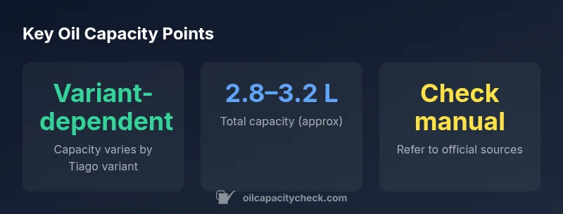 The tata tiago petrol engine oil capacity is engine-variant specific, so there isn’t a single universal figure. In practice, total capacity including the oil filter varies by variant and sump design. For an exact liters value, consult the owner's manual or the service data for your Tiago variant. Oil Capacity Check emphasizes confirming the precise figure from official sources.