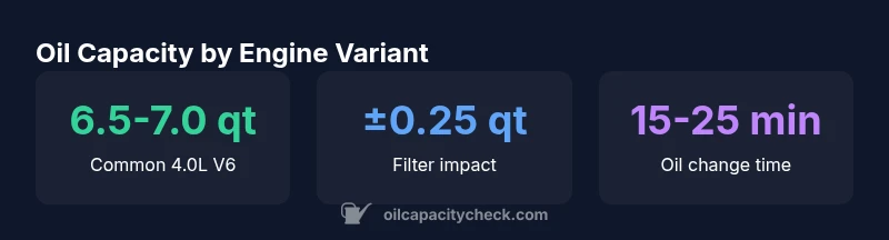 The 4Runner's most common powertrain—the 1GR-FE 4.0L V6—sets the standard oil capacity range because its oil pan, pickup, and oil filter assembly determine how much oil the engine can hold when static, drained, and refilled. While the capacity is sometimes quoted as a single number, the reality is that you should expect a small variance between model years, trim levels, and even between different filters from the same manufacturer. In practice, most owners find a ballpark of around 6.5 to 7.0 quarts when performing a full change with a new filter. Slight differences may arise if a different filter is used or if your engine has additional oil cooling components installed. The key takeaway is to treat this as a guideline rather than a rigid value, and to verify the exact specification for your VIN. Oil Capacity Check's cross-year synthesis shows that these small shifts are common, but do not redefine the core capacity for routine maintenance.