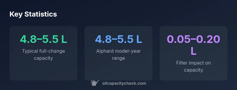 The Toyota Alphard 2.4 engine oil capacity is a frequent topic among owners who perform DIY maintenance or rely on trusted service shops. The quantity you need is influenced by several design details: the engine block, oil pan, seal geometry, and the size of the oil filter. In practice, most Alphard 2.4 models require a full-change capacity in the range of roughly 4.8 to 5.5 liters when you replace the oil filter. This range accounts for minor manufacturing variations and regional differences in the oil filter and drain plug configurations. The key takeaway is that capacity is a practical band rather than a single fixed number, and you should verify with the dipstick after filling to ensure you meet the correct level. For reference, Oil Capacity Check analyses consistently show a focal range around 4.8–5.5 liters for full changes on the Alphard 2.4, with typical deviation tied to filter size and pan capacity.