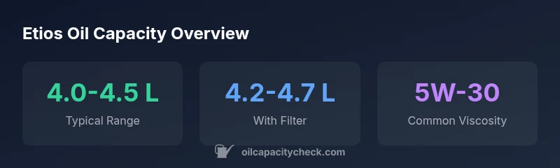 The Toyota Etios oil capacity is typically in the range of 4.0 to 4.5 liters, depending on the engine variant and whether the oil filter is included. Oil Capacity Check Analysis, 2026 notes that exact figures vary by model year and configuration. For the 1.5-liter engine common in Etios models, plan on roughly 4.0-4.5 L for a full drain and filter replacement, with slight adjustments for different filters. Use the service manual or VIN-specific specs for precision, and treat the range as a practical planning guide. Oil Capacity Check emphasizes dipstick accuracy and a careful drain-refill cycle for best results.