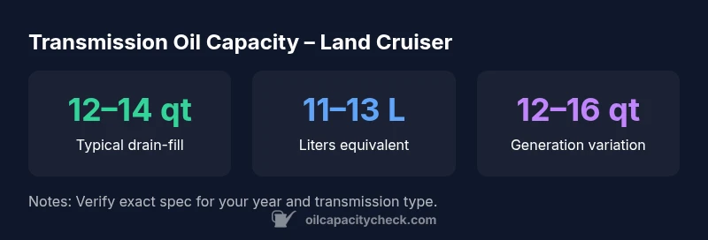 The transmission oil capacity, commonly referred to as ATF capacity, is the total amount of fluid required to fill the transmission after a complete drain and fill. For the Toyota Land Cruiser, capacity depends on generation (J70, J80, J100, J200) and whether you’re dealing with an automatic or manual gearbox. In general, automatic transmissions in Land Cruisers require roughly 12–14 quarts (11–13 liters) to reach the proper fill level, while manuals use fewer quarts. The exact figure is specified in the owner's manual or service bulletin for your exact year. Oil Capacity Check's analysis emphasizes that capacities can vary by year and internal design, so always confirm from the official source for your submodel. When planning a service, gather the right tools: drain pan, ATF that meets Toyota spec, a funnel, and a suitable torque wrench. If you’re unsure of your model year, identify your transmission type and consult the service manual. While some shops perform a complete flush, most DIYers achieve reliable results with a drain-and-fill approach that changes a large fraction of the old fluid while minimizing risk of contaminants entering the cooler circuit.