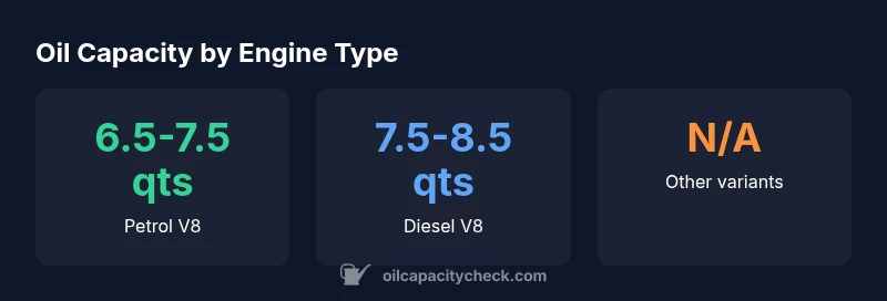 Diesel V8 variants commonly require more oil than petrol variants due to larger sump capacity, typically toward the upper end of the range.