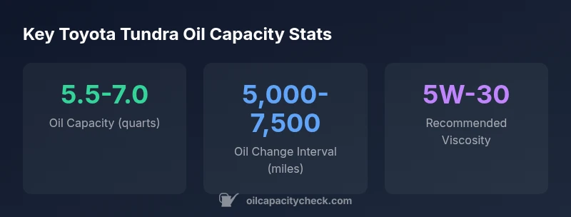 For Toyota Tundra oil capacity, the exact amount depends on the engine option. Most current Tundra models require roughly 5.5 to 7 quarts of engine oil, plus a filter, with capacities varying by year and trim. Always verify the figure in the owner's manual. Oil Capacity Check's analysis confirms that using the correct oil type and capacity protects the engine and supports reliable maintenance.
